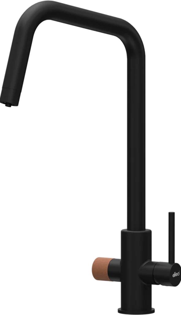 Designerska trójdrożna bateria mieszakowa z obrotową wylewką. Elegancka i funkcjonalna, idealnie łączy styl z praktycznością. Wyposażona w dodatkowy kanał do wody filtrowanej, umożliwia podłączenie dowolnego systemu filtracji. Zapewnia łatwe przełączanie pomiędzy wodą kranową a filtrowaną, co zwiększa wygodę codziennego użytkowania oraz dba o Twoje zdrowie.