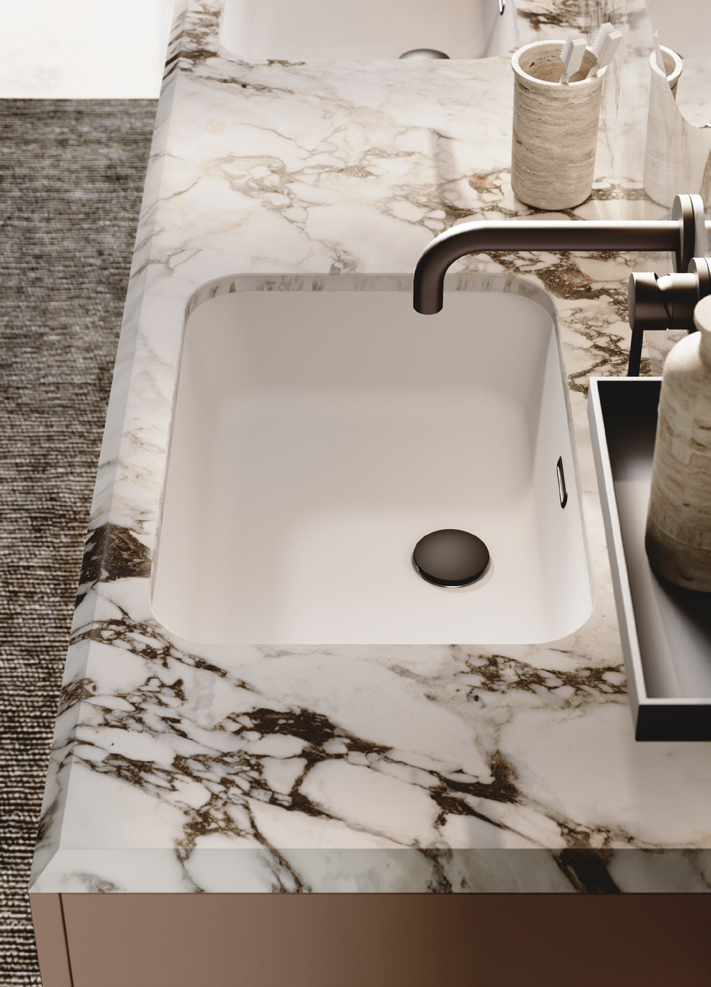 INTENSO 48 to nowoczesna umywalka o eleganckim, minimalistycznym stylu, wyróżniająca się harmonijną geometrią i zaokrąglonymi narożnikami. Jej uniwersalna forma doskonale komponuje się z różnymi aranżacjami łazienkowymi, wprowadzając do wnętrza poczucie ładu i estetycznej spójności. Dzięki przemyślanej konstrukcji, umywalka INTENSO 48 oferuje trzy różne opcje montażu w jednym produkcie – wpuszczaną w blat, podblatową oraz zintegrowaną – co zapewnia maksymalną elastyczność w projektowaniu przestrzeni.