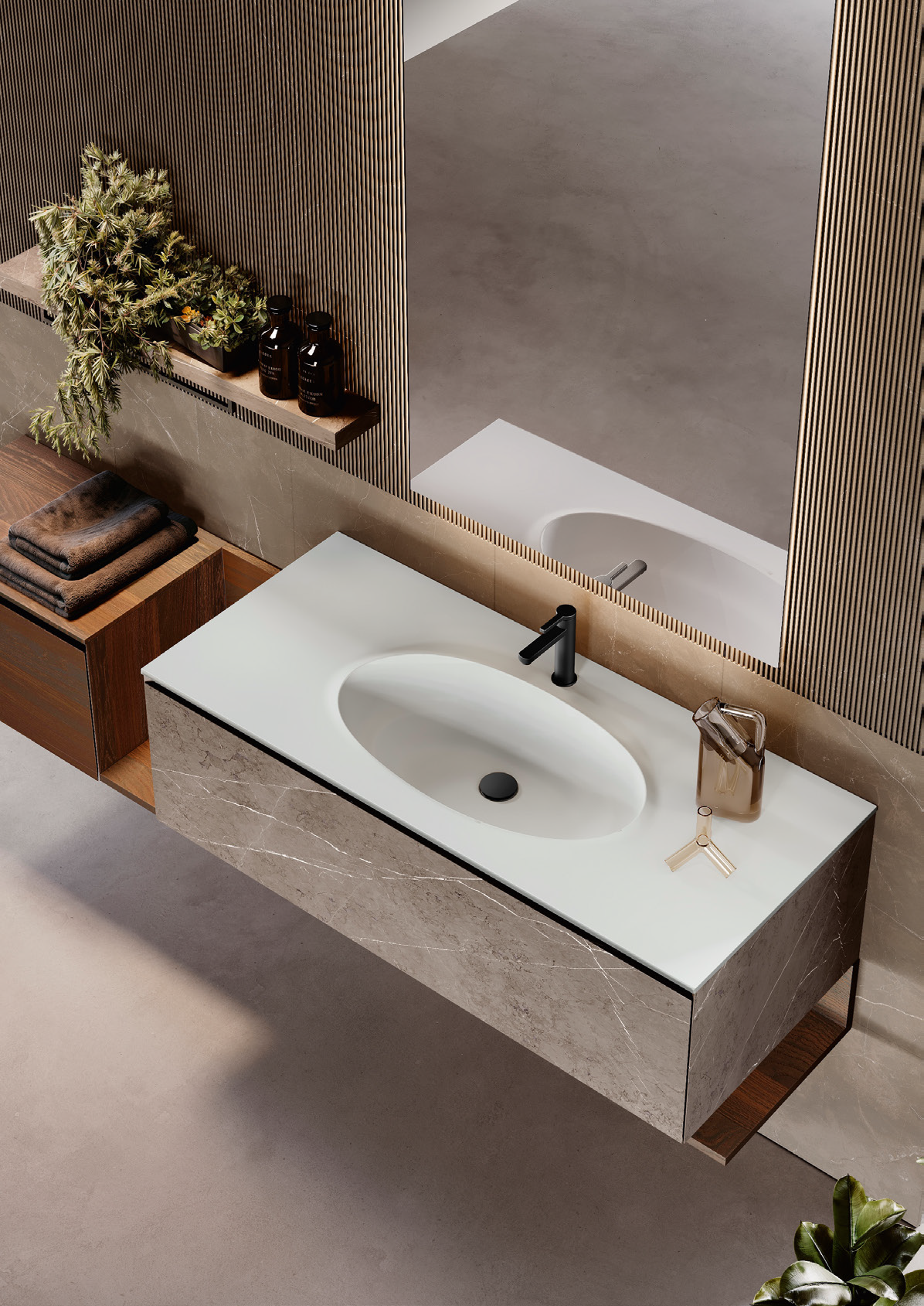 Libero 120 to umywalka, która wyłamuje się ze schematów – inspirowana sztuką modelowania gliny, zachwyca swobodną, celowo nieregularną formą. Każda linia, każde załamanie powierzchni oddaje autentyczność procesu twórczego i głęboki związek z materiałem. Eliptyczna misa z wyższą krawędzią tylną, pełniącą funkcję osłony przed zachlapaniem, to harmonijne połączenie estetyki i praktyczności. Przenikające się linie i subtelne zmiany kierunku przepływu wody nadają umywalce unikatowy charakter – organiczny, niepowtarzalny, prawdziwy.