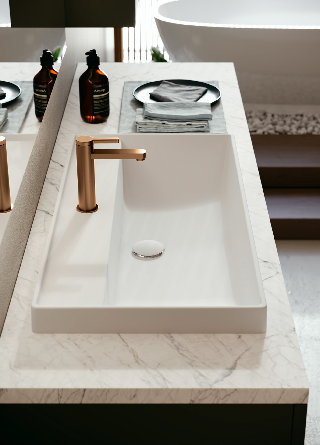 Puro D 80 to umywalka, która łączy subtelność formy z funkcjonalnością codziennego użytkowania. Cienkie krawędzie i pojemna misa tworzą harmonijną całość, zapewniając jednocześnie komfort i lekkość wizualną. Umywalka delikatnie wyłania się z powierzchni blatu, tworząc efekt płynnego przejścia. To wyrazisty element kolekcji Puro, który przyciąga spojrzenie, nie dominując przestrzeni – idealny balans między estetyką a praktycznością.